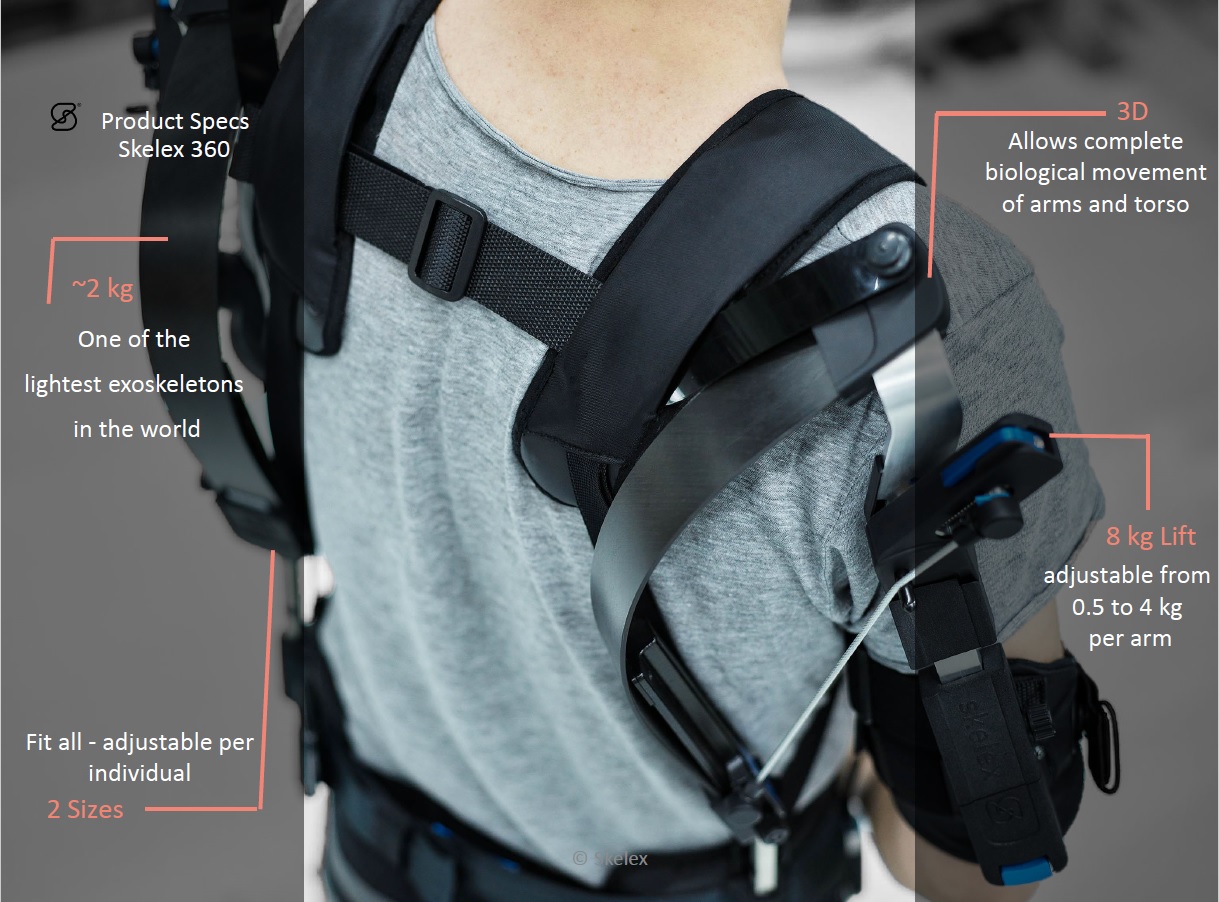 Skelex bouwt exoskeletten die mensen ondersteuning bieden. Deze zijn speciaal ontworpen om het bovenlichaam te ondersteunen, zodat mensen langer, veiliger en gezonder kunnen werken. Ook ondersteunt dit exoskelet de bovenarmen bij repetitieve handelingen vanaf borsthoogte en hoger.
