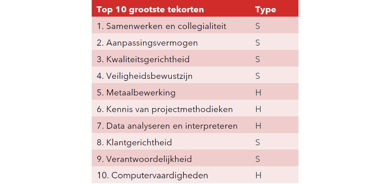 Uit onderzoek dat is uitgevoerd door SEO, in opdracht van FME blijkt dat de tekorten het grootst zijn op het terrein van ‘soft skills’, zoals samenwerken, aanpassingsvermogen en kwaliteitsgerichtheid. Daarna volgen ‘hard skills’ zoals metaalbewerking, data analyse en computervaardigheden.